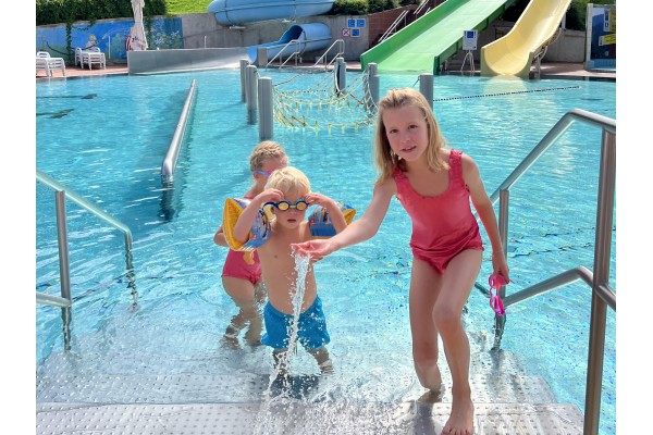 The indoor children's pool with a pleasant 32 °C is the perfect place for first swimming steps and carefree splashing, while in the summertime, the fun moves to the outdoor pools.