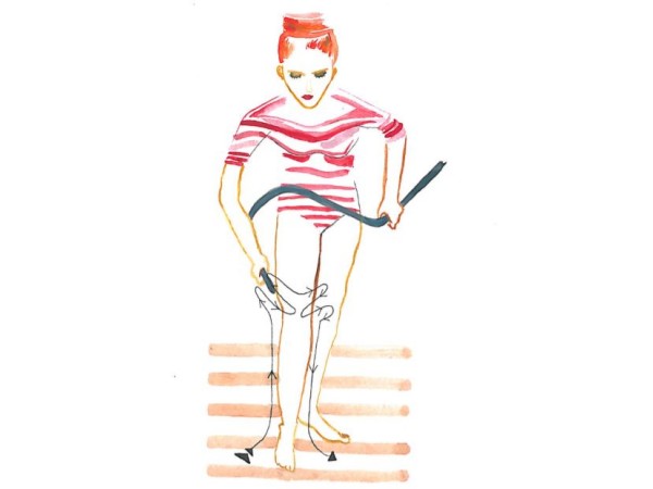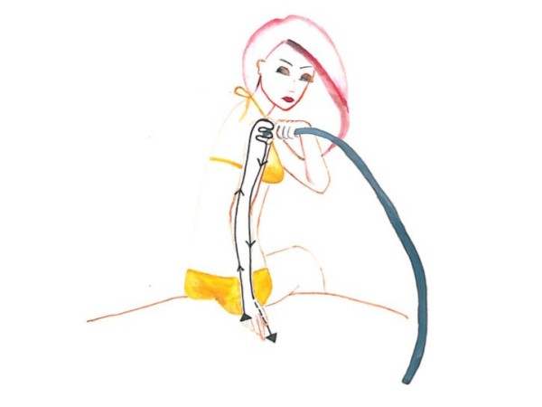začnemo na zadnji strani desne noge, potujemo z močnim curkom vode od desnega mezinca po zunanji zadnji strani goleni do kolena, kjer se zadržimo približno 3 sekunde, nato po notranji strani navzdol do palca na nogi