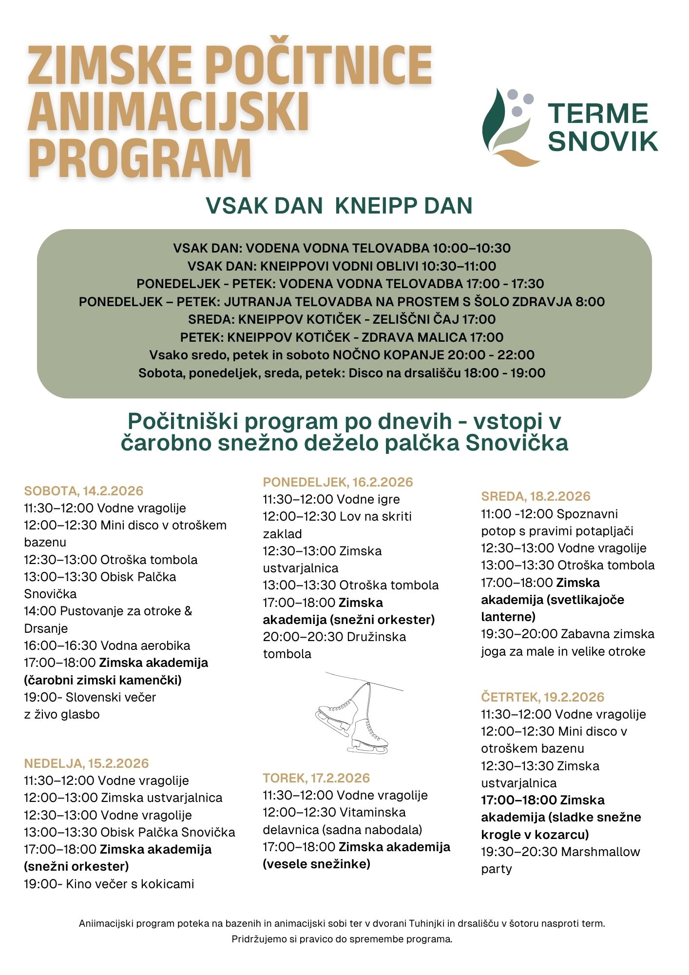 Program dopolnjujejo animacije na bazenu in v naravi, aktivnosti na drsališču, pohod z baklami ter pustno rajanje za otroke 14. februarja 2026.